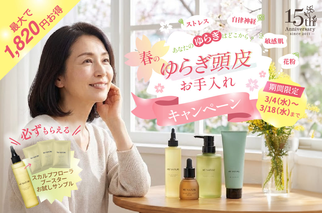 春は、髪が育ちやすい“ベストシーズン”。一方で、花粉や寒暖差による「ゆらぎ」も起こりやすい時期です。外側と内側、両方から整える春限定の頭皮ケアキャンペーンを予定しています。