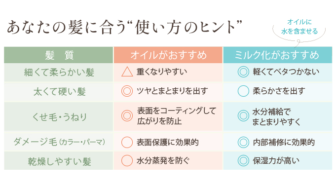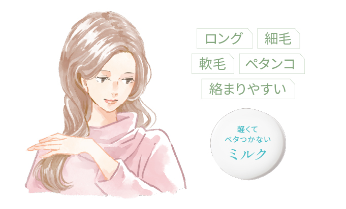 ・細くて柔らかい髪:ミルク化(水を混ぜる)/重くならず、ベタつかない軽やかな指通り
