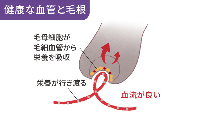 髪を生み出す毛母細胞は、頭皮の毛細血管から酸素や栄養を受け取りながら活性化していきます。