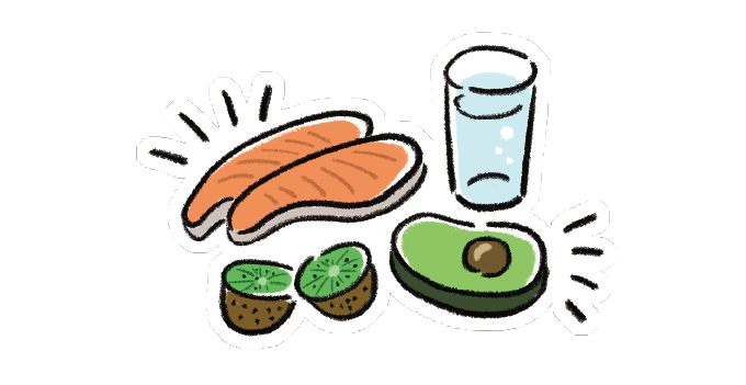 ビタミンC・ビタミンE・オメガ3脂肪酸・たんぱく質などを意識した食生活を心がけましょう。サーモンやアボカド、ナッツ、大豆製品などを取り入れることで、肌の潤いと弾力を内側からサポートできます。